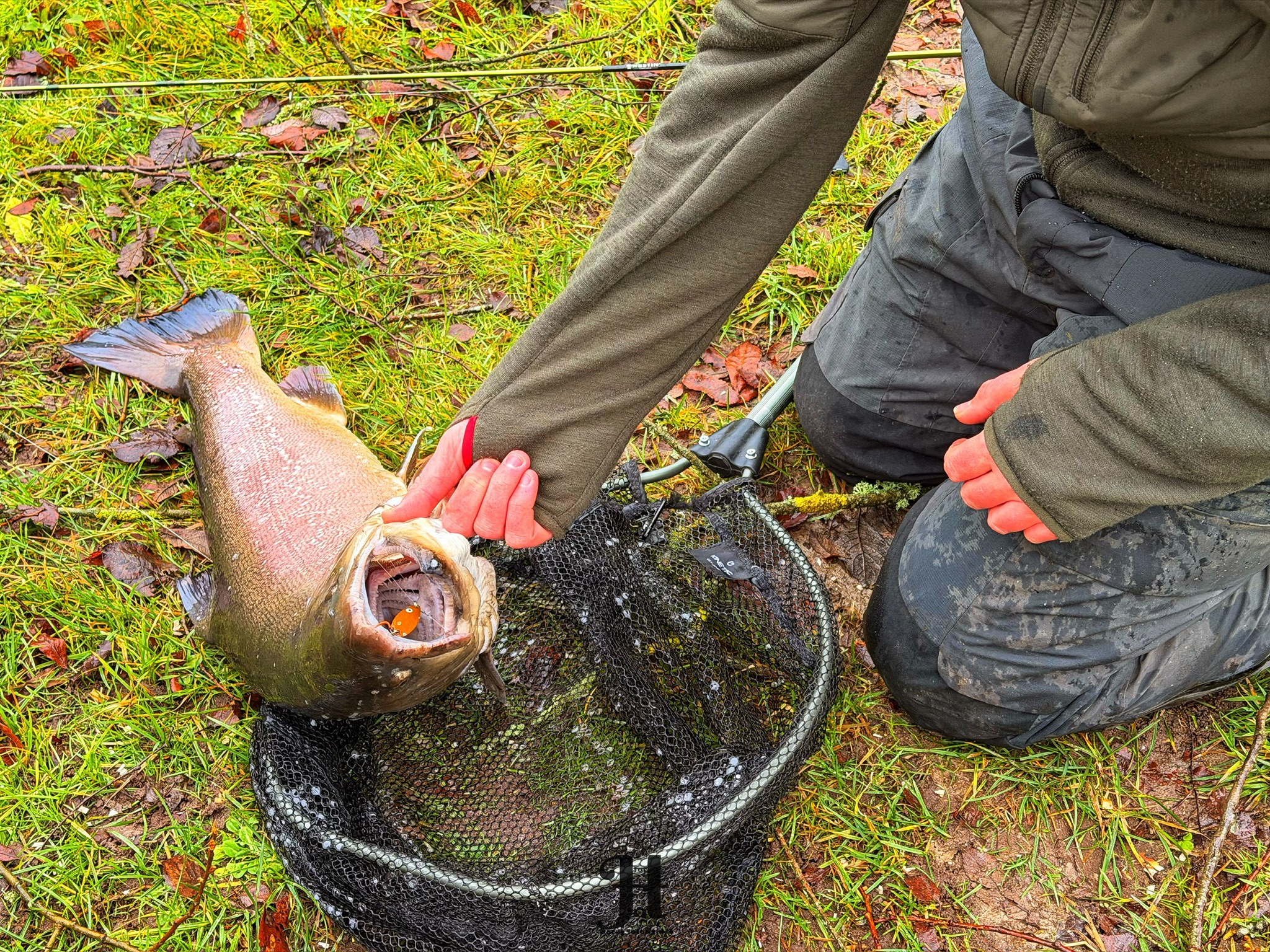 Så vendte heldet igen og pludselig kan jeg mærke noget på linen. Jeg har bid igen. Jeg får kigget på Rasmus men siger ikke rigtig noget. Han spørger om jeg har bid og jeg kan faktisk ikke helt huske, om jeg får fremstammet ret meget. Det føles anderledes og Emil får spottet, at det en sølvørred. Jeg prøver ikke at blive for begejstret, da jeg er bange for at miste den, men efter en god fight netter Rasmus min første sølvørred på 1,4 kg👏