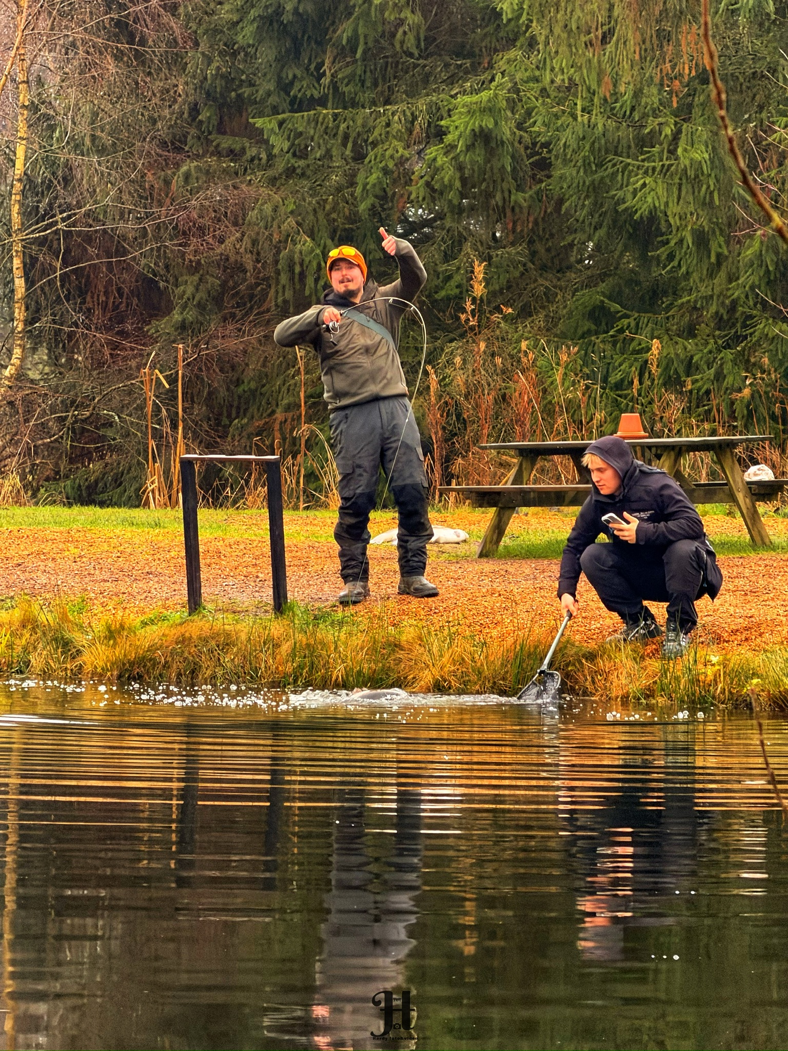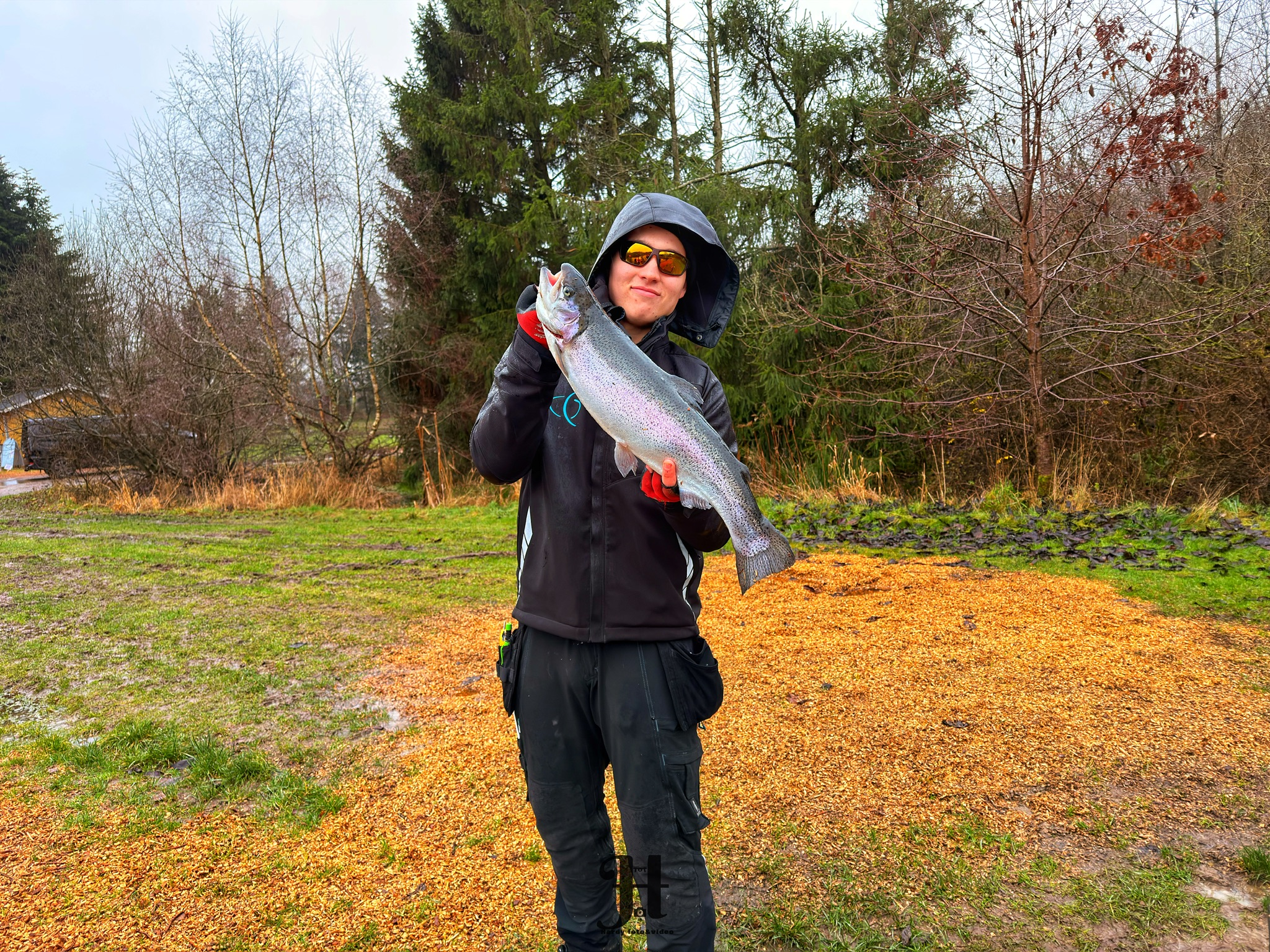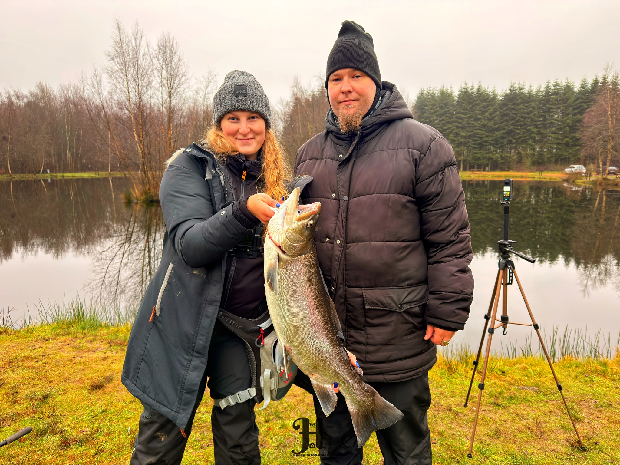 Jeg fiskede fiskede ihærdigt videre og efter få minutter fik jeg igen kontant hug. Endnu nogle gode udløb og ja jeg stod bare og sagde bliv på, bliv på, bliv på mens jeg forsøgte at bevare roen og håbet. Efter en god fight, fik jeg hjælp af Rasmus med at nette fisken. TAK🙏 Hvilken lettelse. En smuk regnbueørred på 3,69 kg med smukke hele finner. Fanget på fidusen slim clown i gul/pink med prikker.